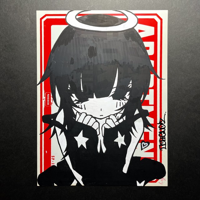 本作品は、手描きによる一点ものです。 サイズ:27cm x 29cm 素材:紙 画材:油性ペン 額や固定具は付属いたしません。別途ご用意ください。 手描きによる制作のため、写真と実物では印象が異なる場合がございます。 また、ご覧になる端末や環境により、色の見え方が異なる場合がございます。 予めご了承の上ご購入いただけますと幸いです。 アート作品として制作しております、経年劣化や剥がれなどは考慮しておりません。 経年による作品の変化や褪せなどもお楽しみいただけましたら幸いです。