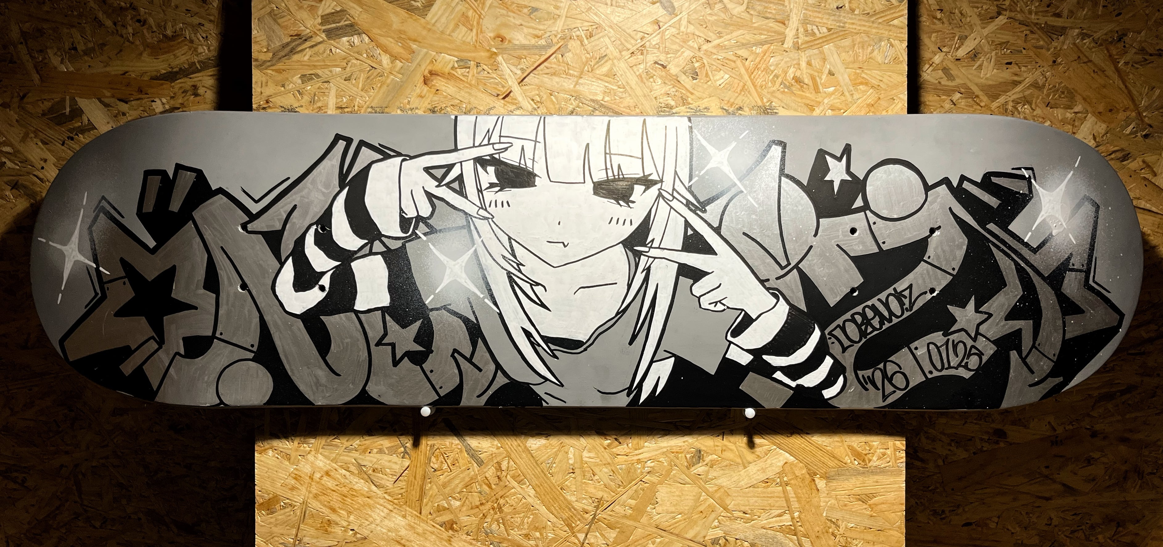 本作品は、手描きによる一点ものです。 この作品は、スケートボードデッキをキャンバスとして使い、グラフィティを描いたアート作品です。デッキを使用につれ傷や汚れが増えていく存在として定義し、キャンバスとして使用。 ストリートで生まれる作品のサイズ、時間軸ともに縮小された作品群。 サイズ:8インチx31インチ 厚み:約1cm 素材:木 画材:油性ペン 額や固定具は付属いたしません。別途ご用意ください。 購入に当たって使用目的など問いません。 観賞用としての販売です。デッキとしての性能は担保しかねます。 手描きによる制作のため、写真と実物では印象が異なる場合がございます。 また、ご覧になる端末や環境により、色の見え方が異なる場合がございます。 予めご了承の上ご購入いただけますと幸いです。 アート作品として制作しております、経年劣化や剥がれなどは考慮しておりません。 経年による作品の変化や褪せなどもお楽しみいただけましたら幸いです。