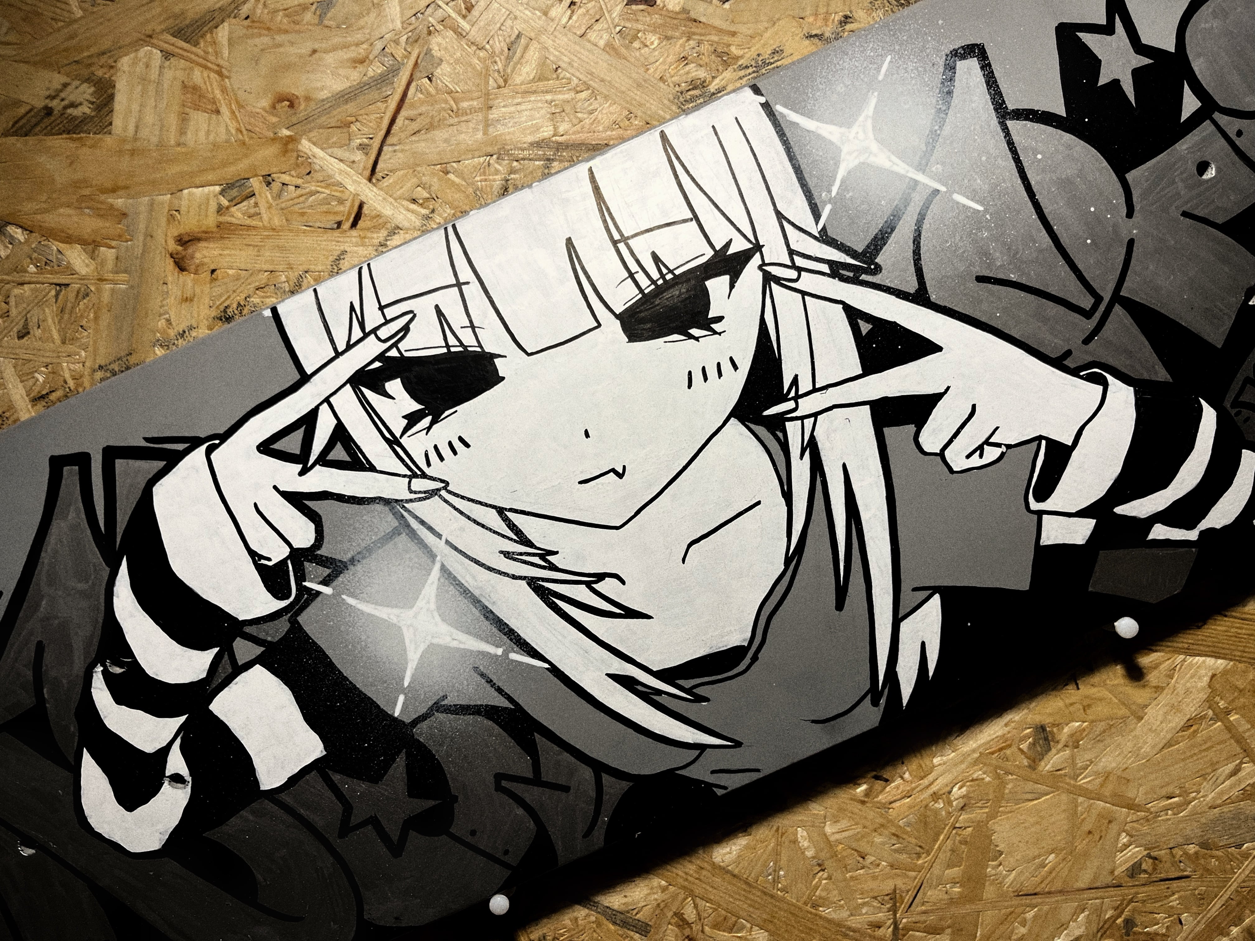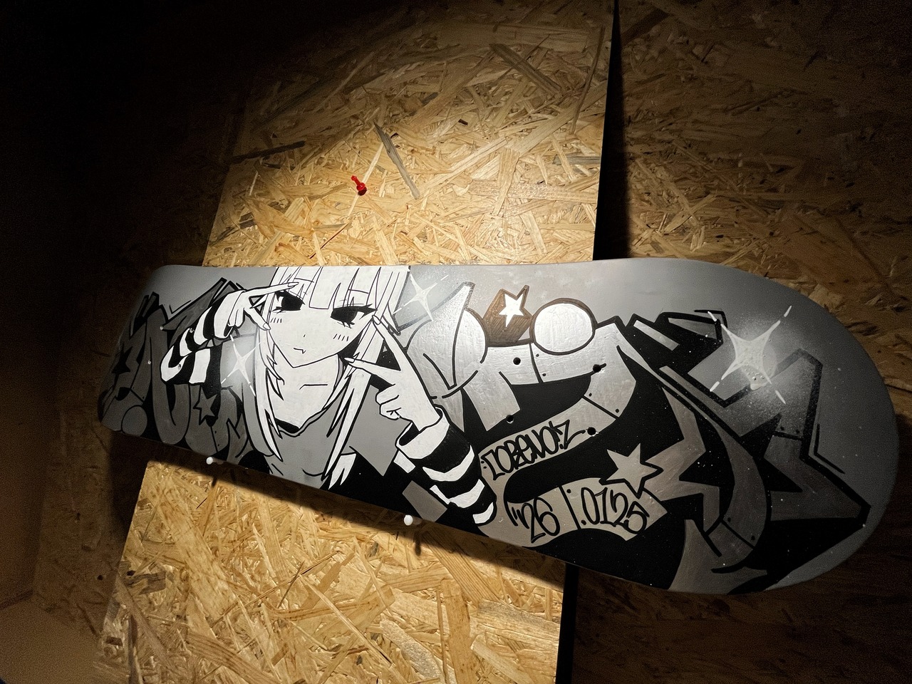 この作品は、スケートボードデッキをキャンバスとして使い、グラフィティを描いたアート作品です。デッキを使用につれ傷や汚れが増えていく存在として定義し、キャンバスとして使用。