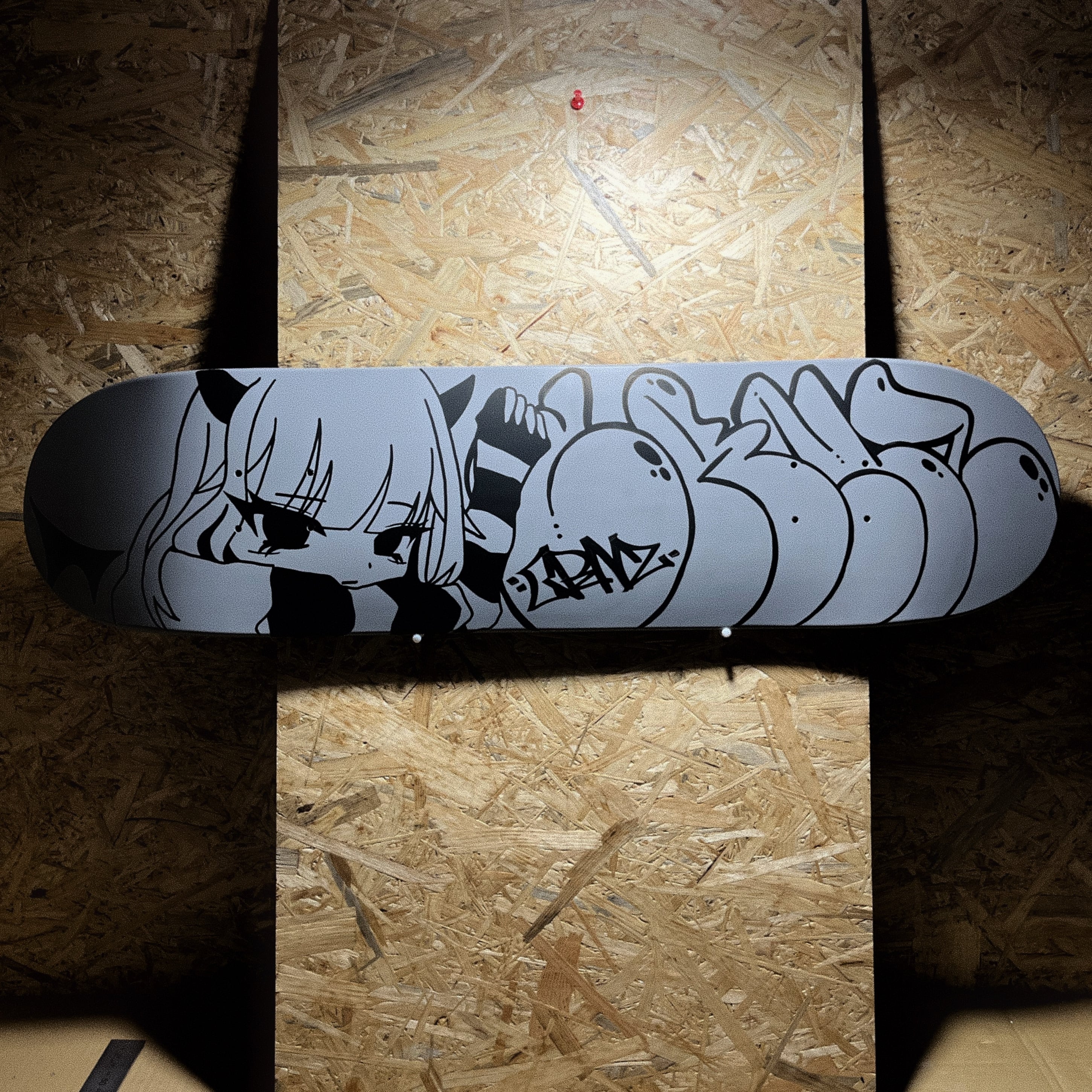 この作品は、スケートボードデッキをキャンバスとして使い、グラフィティを描いたアート作品です。デッキを使用につれ傷や汚れが増えていく存在として定義し、キャンバスとして使用。